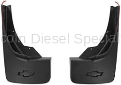 GM Front Set, Black Grained Finish with out Logo. Designed to accent the exterior of your Duramax, these Molded Splash Guards fit directly behind your front wheels to help protect your truck from tire splash and mud. Includes all hardware and instructions for install. (Black, No Logo)